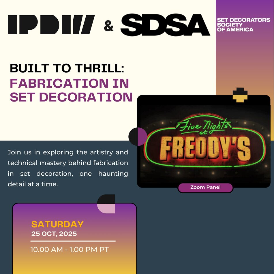 BUILT TO THRILL: Fabrication in Set Decoration. From concept to creation — In this Zoom Webinar, discover how sets are fabricated, one haunting detail at a time. Explore the artistry and technical mastery behind fabrication in set decoration. Whether you're a working Set Decorator, aspiring Designer, or simply fascinated by the integration of traditional craft and cutting-edge technology, this online event will provide valuable knowledge and behind-the-scenes perspectives you won’t find anywhere else. October 25th 10:00 am (PT)