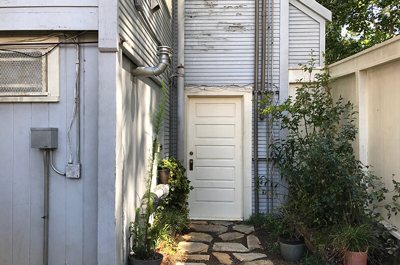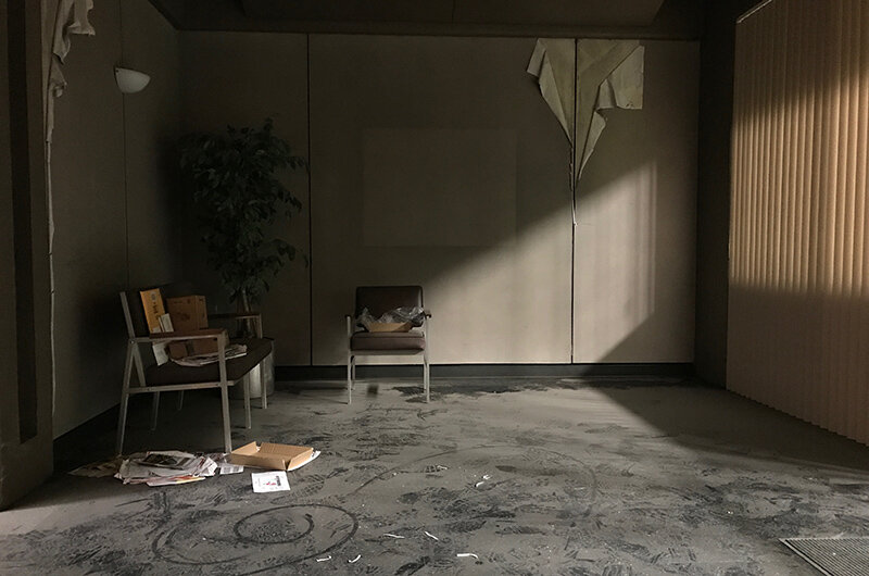 Inside of the building facade (which traveled to locations such as a San Francisco parking lot and deep into the forest of neighboring Muir Woods), is a derelict elevator lobby. The notion is that the building is so nondescript from both the outside and the entry that one might not recognize its sudden appearance. Or disappearance!