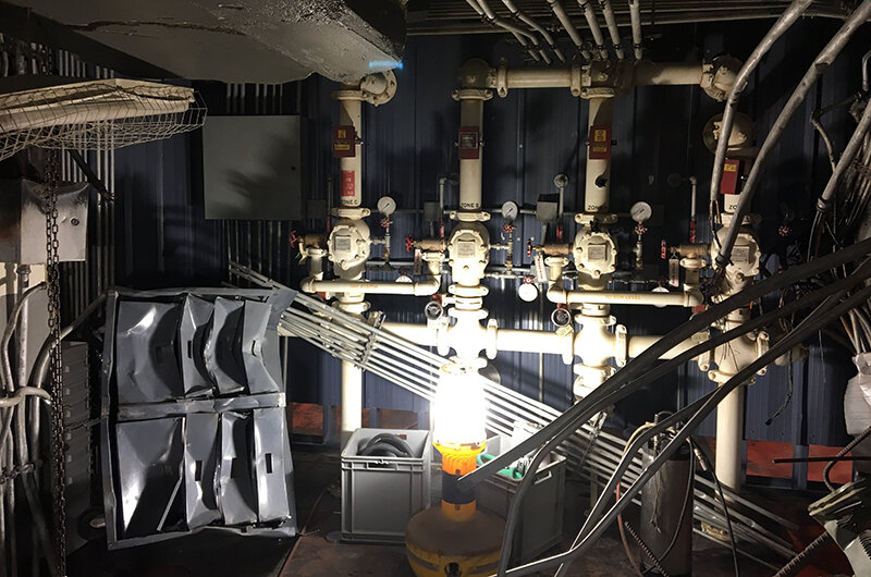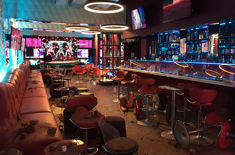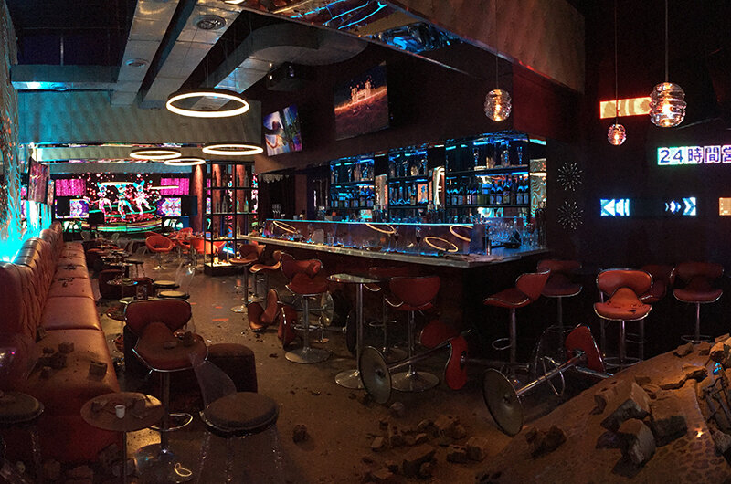 The destroyed sets were created on stage. The furniture, pipes, electrical conduit, light fixtures, circuit breaker boxes, etc. were usually purchased new and then destroyed in place or run over with large machinery to give them that bent and twisted look that we so desired. This was a lot of fun for the Set Dressers, who were charged with destroying all kinds of life-sized toys. It was bumper cars every day!