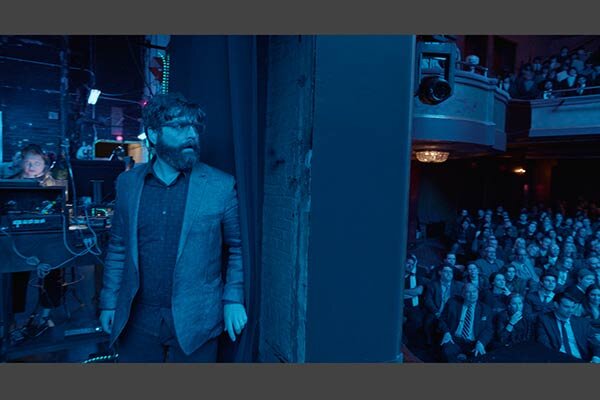 Riggan [Michael Keaton] deliberates with his best friend and producer Jake [Zach Galifianakis]…as the situation worsens, the wall and ceiling seem to close in on him…because they did!