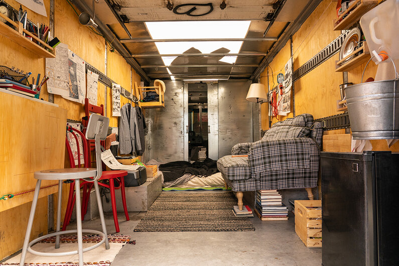 “Casey is an unemployed graphic artist partially living out of his moving van...he never quite finished finding a place to move. So, this was another fun space to do. And we had to do it twice! One that actually was used on the street, and one for the stage. Finding a balance between ordinary, creative and something fun to look at took some time to finesse. We also had to think about how things would be strapped down and corralled for stunt driving and all of the physical comedy.”