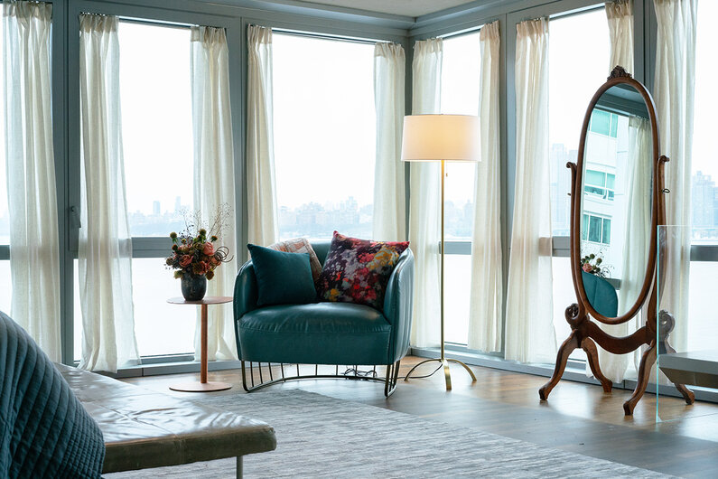 Ryle’s Loft, pre-Lily. Ryle, the surgeon, lives in an expansive loft with pale neutral tones and floor-to-ceiling windows, the opposite of Lily’s colorful and whimsy-filled BoHo spaces. Once Lily moves in, we see a change in the mood and vibe of the space.
