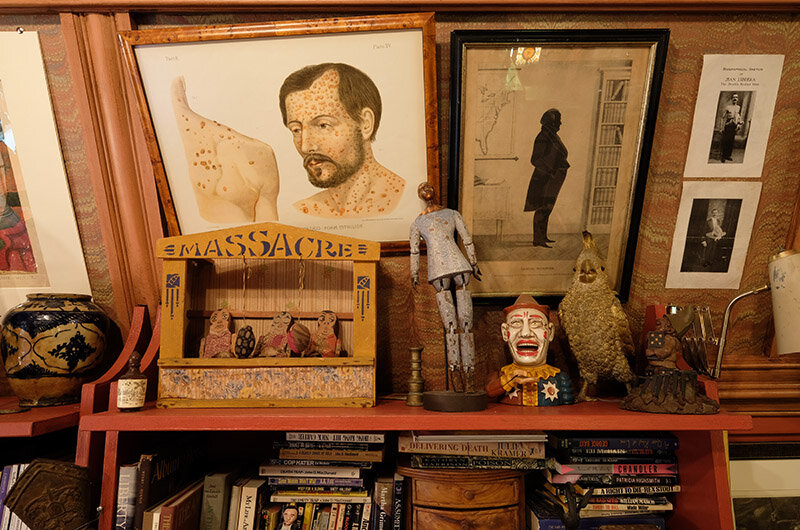 I have always loved the crime scene dioramas created by Frances Glessner Lee in the 1940s. What a perfect object for Harlan. We created several using doll houses, and a few just free form. I initially bought the large Doll House which plays in the library with the intent of using it as a crime diorama. It morphed into being the Library’s Bar.