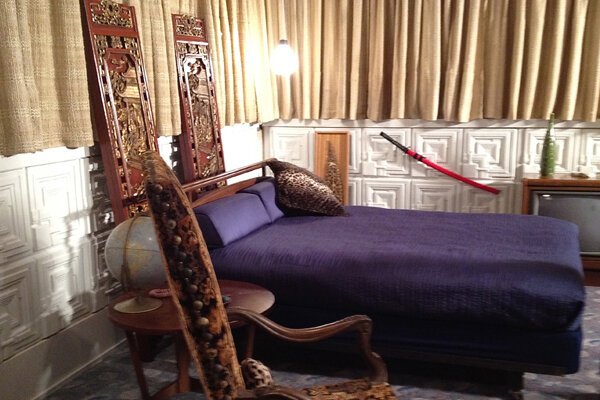 “Because I had done CIRQUE DU FREAK along with Eva and Bill, we knew that some unusual things existed,” shares Smith. “The round bed in Chuck Traynor’s house is from RC Vintage, but the slip cover is a 1940s pattern. Eva and I had bought two very long Middle Eastern bedspreads with mirrors & embroidery for CDF. So we pinned one around the bed and covered the headboard, and used the other as the bedspread."