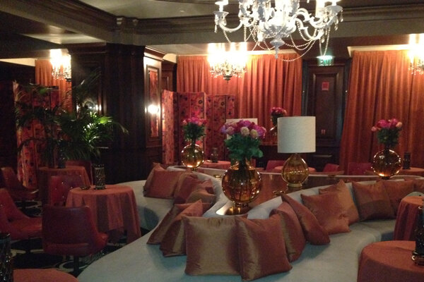 "We also did a night club, which we shot in the contemporary cocktail bar at the Langham Hotel, the former Ritz, a bar that Bill and I had shot for AMERICAN DREAMS. Since then, they’ve made it sort of 2010, with an amoeba-shaped sofa and a patterned carpet. So we brought in orange velvet curtains and just masked the whole thing, turning it into a darker room. The standing divider screens are actually more draperies loosely tacked to frames. The vases are from CRAZY, STUPID, LOVE…and of course, I knew where they ended up and where to find them! The masses of orange pillows were found at various home stores. It was rather astounding that we could find so many. The red chairs are from Omega Cinema Props. We dressed the bar at 3:00 in the morning. They shot it at 6:00 am, and it was back, restored and opened for business at 11:00.”