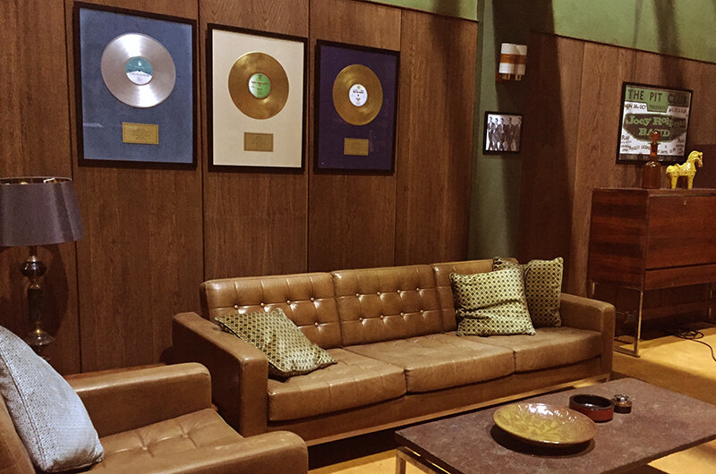 Thus, while Elton’s childhood home has that beiged-down vintage realism [and an opportunity to use truly vintage wallpaper and fabrics!]...and there is a sublime re-creation of Mama Cass’s Laurel Canyon house [filmed not in the Hollywood or Malibu area, but entirely built & furnished in the UK]...the fantastical is evident in the Versace-esque offices for John Reid [not period-correct, Farr will point out, but the director wished to do an homage to Elton’s friend] and totally realized in the Honkey Cat sets for increasingly over-the-top numbers John was compelled to create as his fame grew.