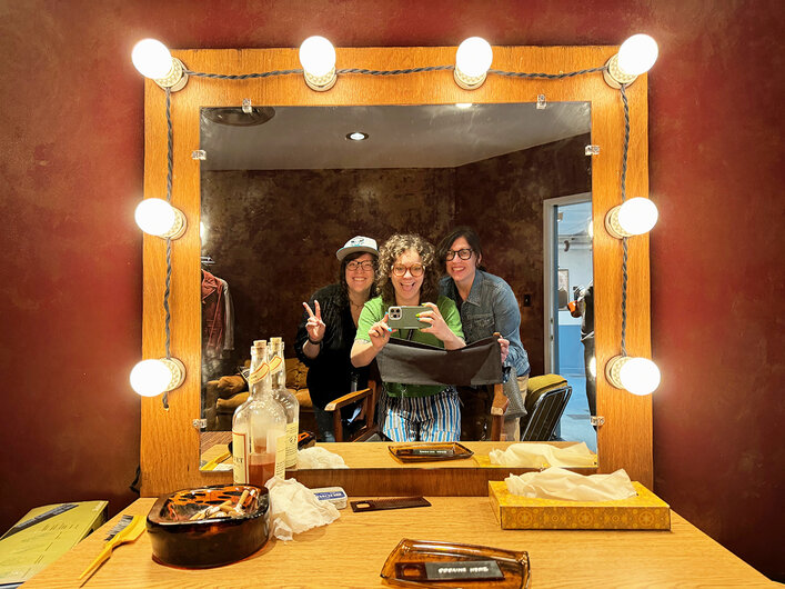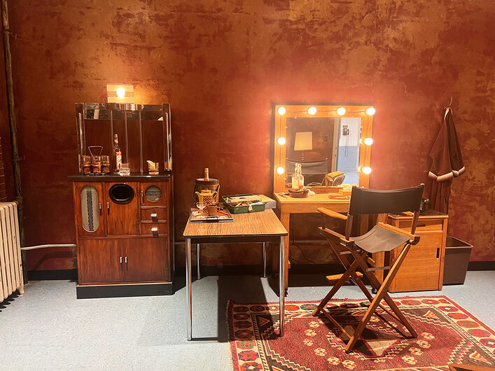 Two-shot of the Hair & Make-Up Room. The muted earth colors give balance to the stronger palette of the Dressing Room we see through the doorway. Who doesn’t love the brown sink! Photo by Claudia Bonfe © 2024 CTMG, Inc. All Rights Reserved.