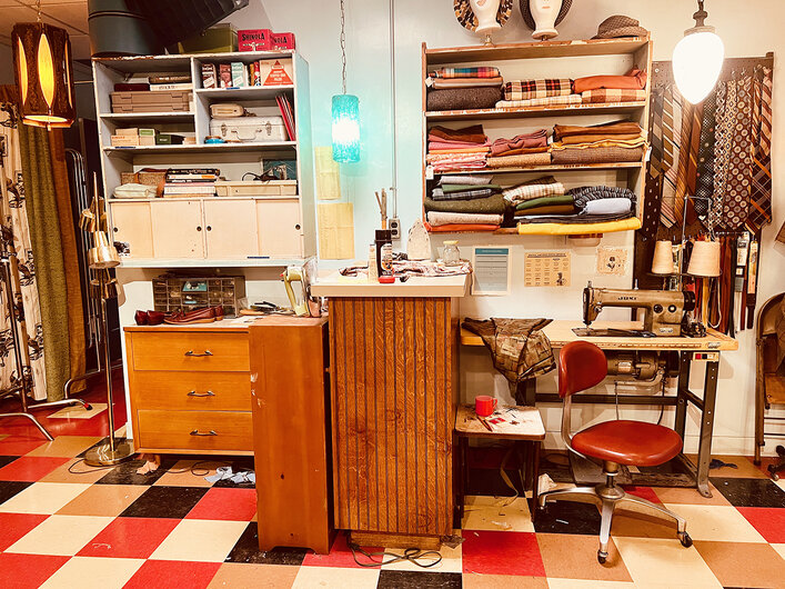 I found a photograph of a 1970’s supermarket which had a persimmon-colored carpet throughout. I couldn’t think of anything else for the floors. It was a hard color to match, but the magician Jenn Sandel made that happen. Surprisingly, there was a stocked wooden blind ribbon in that exact color.