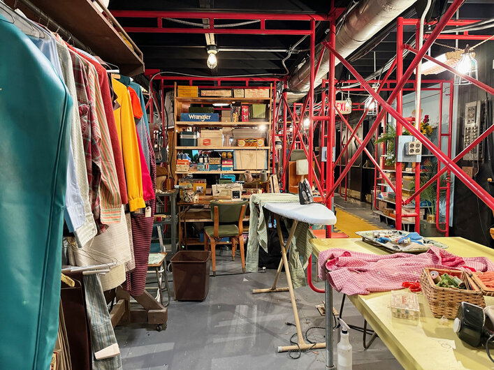 Behind the scenes of the behind-the-scenes! These are Studio 8H, stage-adjacent annex workspaces being recreated under the scaffolding, below the audience seating, just as they were in 1975. Pictured is the “work in progress” set dressing and construction areas. Photo by Drew Monahan © 2024 CTMG, Inc. All Rights Reserved.