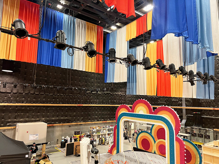 We built a two-story set in a large soundstage at Trilith Studios. It consisted of the SNL Studio 8H stage with smaller sketch builds within, including the audience bleacher seating area, scaffolding workspaces and a freight elevator.