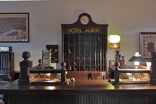 We constructed the hotel lobby interior and a hotel guest room (cut from the final film), within the courthouse. We couldn’t paint anything but we built onto an existing front desk in the main hallway, adding the room-key holder, painted glass, Confederate Army etchings, and tall antique caned arm chairs borrowed from an upstairs courtroom…super southern and designed for hot weather. I had never seen anything like them and thought they’d be perfect. Lots of little touches, like a glass wall case with Chamber of Commerce notices, a Lynchberg Steakhouse menu, vintage Diners Club and Visa illuminated signs, Cigarette machine, fans, a phone booth, etc. helped sell the place as a hotel lobby.