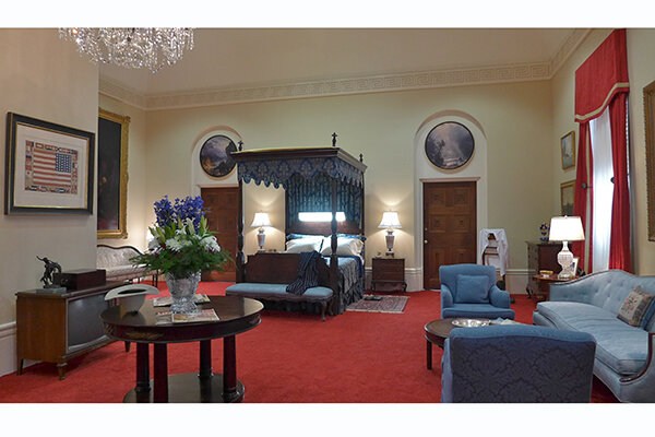 The set reflects the fact that she was often alone raising four kids by herself while her husband was on the road at meetings, speaking, organizing, etc., therefore the house was a bit more feminine in tone.