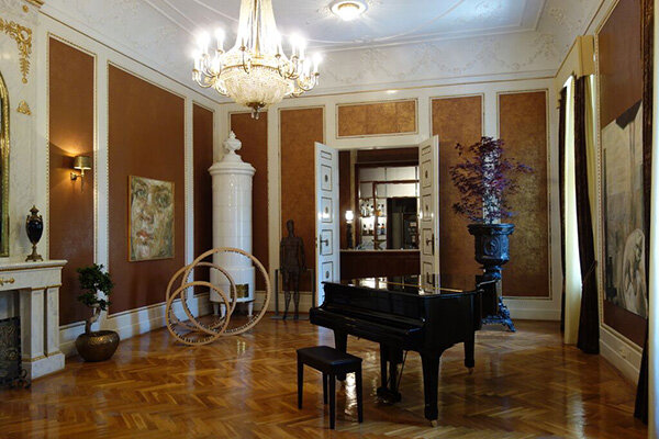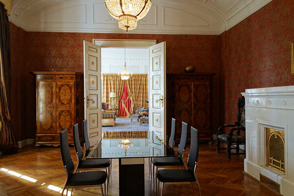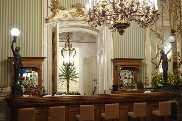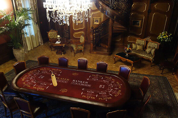 The location used for the plush casino is the historic Metropolitan Ervin Szabó Library, in the former Wenckheim-Palace. Berry recalls, “Once I saw the location, I realized I wouldn’t have to have a lot of artwork, because there are so many large windows…but of course, that meant a lot of drapery, particularly since these windows were about 20 feet high! And it had to be a certain quality. It had to look rich and be very beautiful. Fabric in the quantity I needed was very limited, so we had to order all the drapery fabric.”