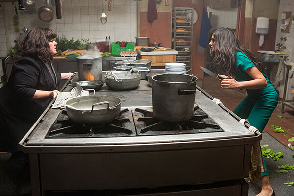 The action moves from there to a fight scene in a nearby restaurant kitchen, filled with “weapons”: knives, pans…produce!