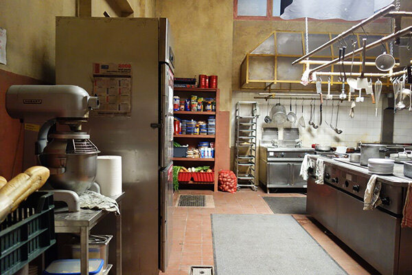 “The art department built two wild walls to define our set built into the existing kitchen area of the building. And then, of course, we had to figure out a way to move the heavy and gigantic stove into the center of the room! My draftsperson designed the height-adjustable overhead pot rack on which we hung the butcher knives and some pots and pans.”