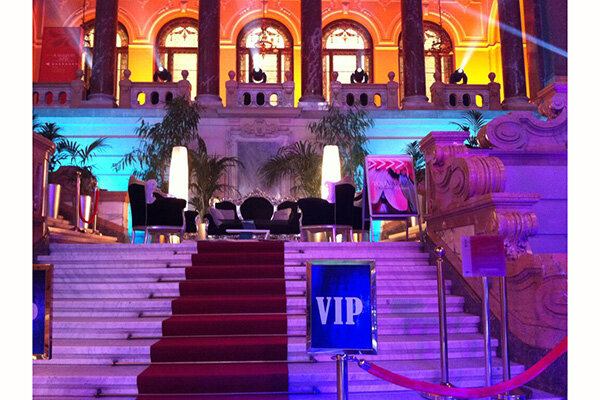 “For this indoor/outdoor summer gala, we created 2 bars and full back-bars, rented gazebos and fringed gold and white striped umbrellas. We built all the drapery and pillows, many with a gold Greek key motif, ochre tablecloths, party food and drink. We also rented the marble sculptures, planters and stands. All the florals and greenery were brought in and dressed. The furniture and practical lighting fixtures were rented from Schmiedl in Vienna, Austria and from Artcore Antik & Design, a Budapest Art Deco vendor who rents original furniture and lighting pieces and also designs and fabricates Art Deco Style furnishings. The entire outdoor entertainment area was a build. We rented the fountain and urns, but the boat dock was a total build. It self-destructed during a windstorm prior to our shoot days and had to be quickly rebuilt.”