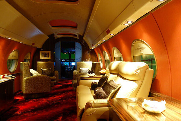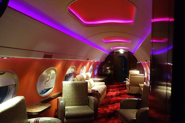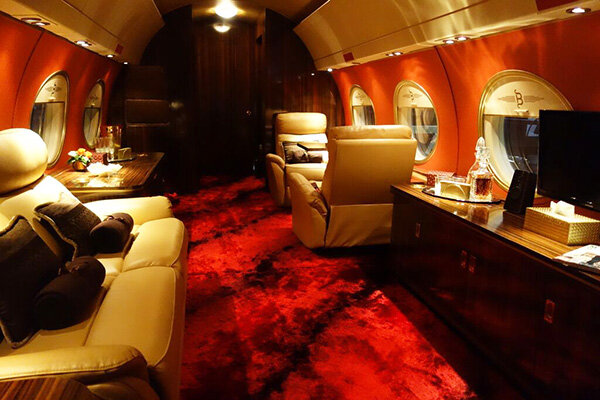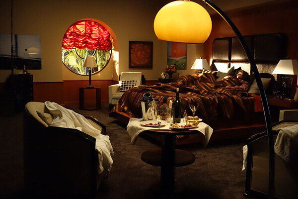 Replete with her unmistakable style—snakeskin upholstery and Versace red and gold wallpaper—Rayna’s private jet was a gimbaled set. Berry points out, “This set was a total build. We designed and built the snakeskin swivel chairs and all of the cabinetry. Under-cabinet directional lighting was shipped in from the United States. We bought a few pieces of leather furniture and had them dyed to our color choice. The entire cockpit dashboard control panel was a build, as well. The pieces were ordered and assembled based on photo research. A local father and son team put the dashboard together using practical airplane elements combined with flight simulator parts. The monitors were made by integrating promo tablets from Dell!”