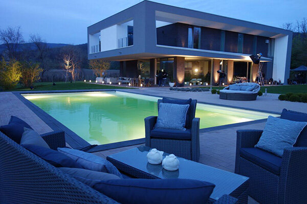 Another distinctive set was Rayna Boyanov’s contemporary house, a minimalist art piece. “I loved having this set among all the film’s traditional style locations,” Berry smiles. “For the interior, we rented the black lacquer and glass square table, all of the chairs and the tall rosewood speakers from the aforementioned Artcore Antik & Design showroom. All pillows and throws were custom-made for this location and our beloved villainess, Rayna. The exterior lighting and furniture was a combination of purchases and a few of the homeowner’s elements. We also added our own greens and succulent arrangements.