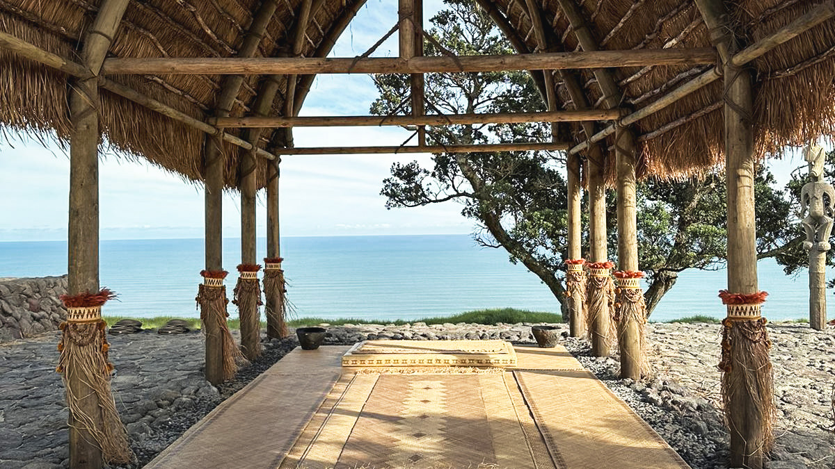 Kualoa temple, King’s chamber. Note the intricate designs in the woven mat/carpet and king’s throne/mat. Courtesy of Apple TV+