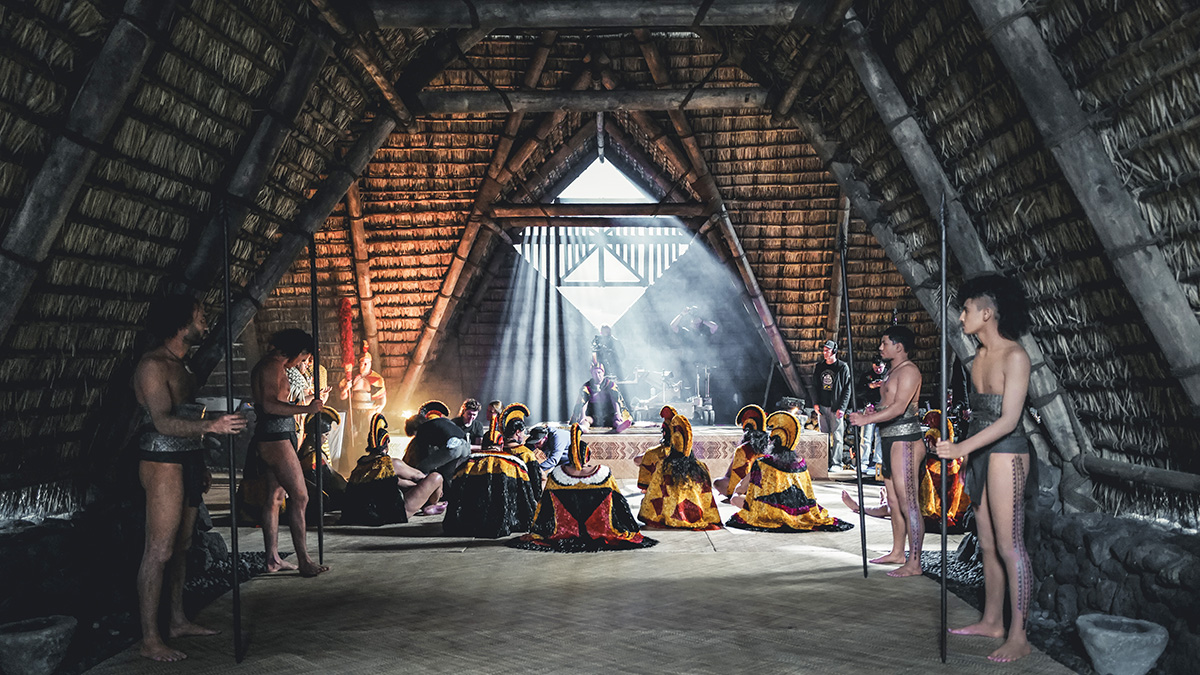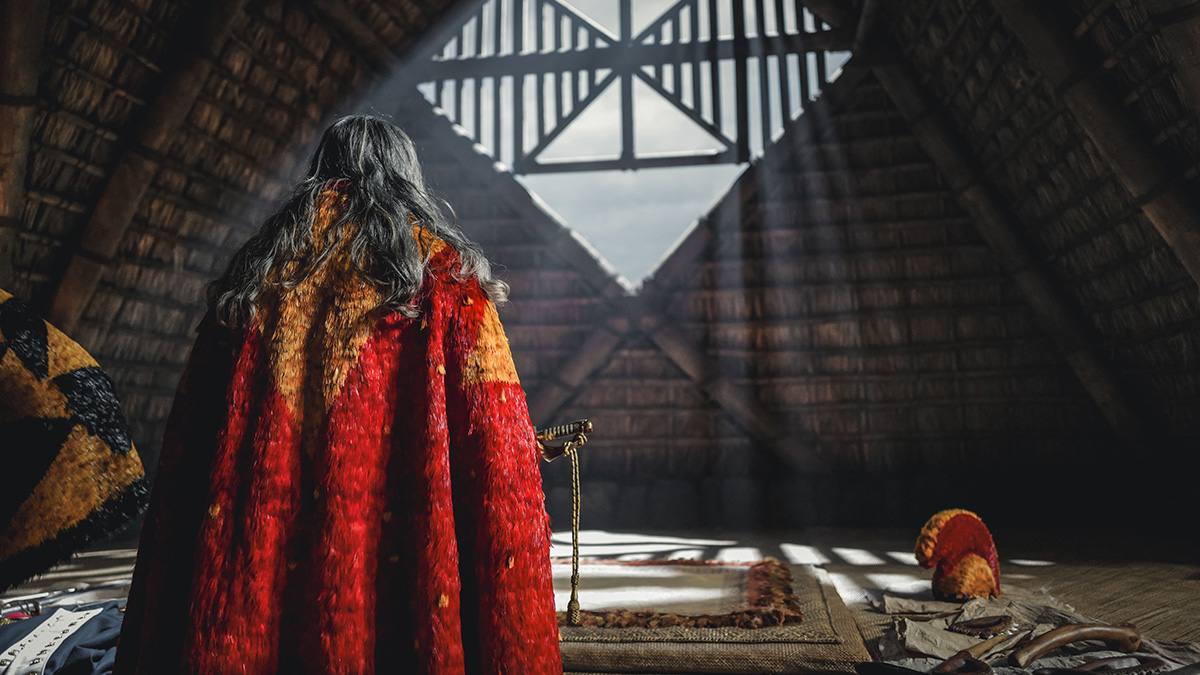 Stronghold of Ka’u, Hawai’i. Keoua becomes king after the death of his father. Note the similar design in the gable and the dramatic lighting it affords. Courtesy of Apple TV+