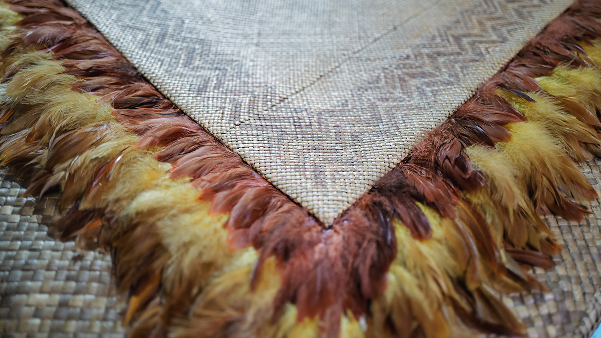 The king’s seat: King Kalani’opu’u, King of Hawai’i. Red feathers and yellow feathers were considered top hierarchy. Note, the king’s mat has both, plus a highly refined woven pattern. Courtesy of Apple TV+