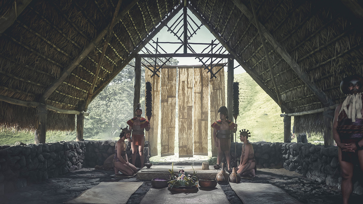 Spectator hut of King Kahekili, King of Maui, where he sits to observe his warriors’ training, while shaded, served and protected. Note the different design motif of the crossbar eaves- from that of King Kalaniopu’u of Hawai’i. Courtesy of Apple TV+