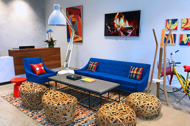 The location had this large section of wall that needed to be covered, roughly 20’ wide by 8’ high. I had recently gone to Mass Moca where Sol Lewitt has a standing exhibit that inspired me to have our Graphic Designer Lori West create the large geometric piece in a gradation of blues with graphic black lines. I also chose a large sculpture of paint cans hammered into a flower, from HD Buttercup.