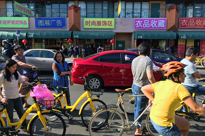 The Art Dept. made literally hundreds of huge signs and graphics, our prop master was able to bring a hundred yellow OFO bikes.