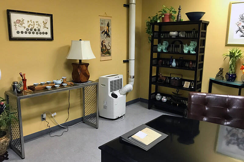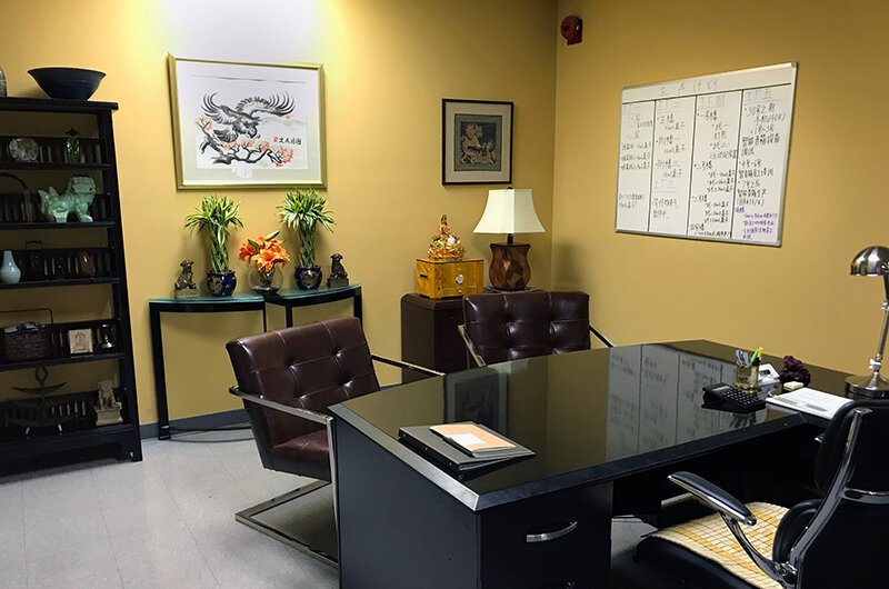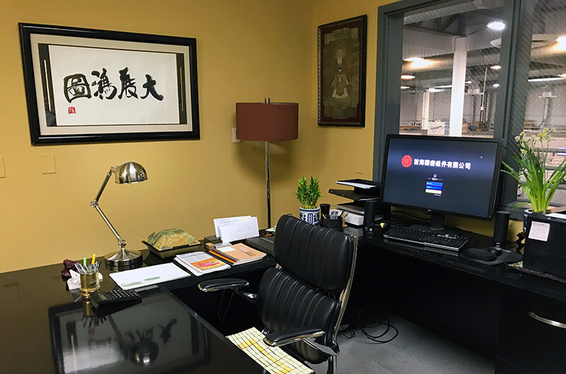 The painting of running horses near Jian Yang’s desk is traditional Chinese art directing success to the company.