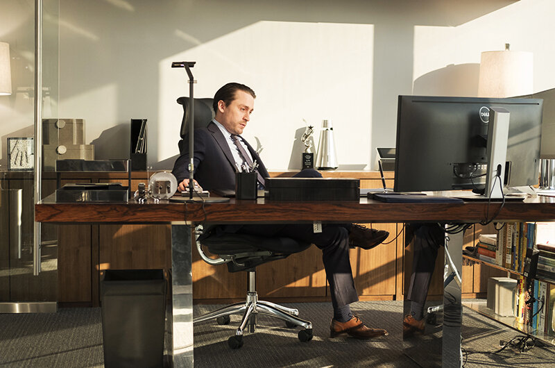 “Steve Carter, our production designer, and his team of art directors designed several stage sets: our main set, Logan Roy’s Townhouse, along with a complete luxury hospital wing and suite, a few other rooms, and a corporate gym. Along with the stage sets, we designed the corporate setting for the Roys’ international media conglomerate, Waystar, which was built on location in a completely empty floor in New York’s World Trade Center. Starting with a stark, raw space and uneven concrete floors, we faced the challenge of creating a modern, glistening corporate headquarters in under four weeks—floors, walls, ceilings, furnishings and all!”
