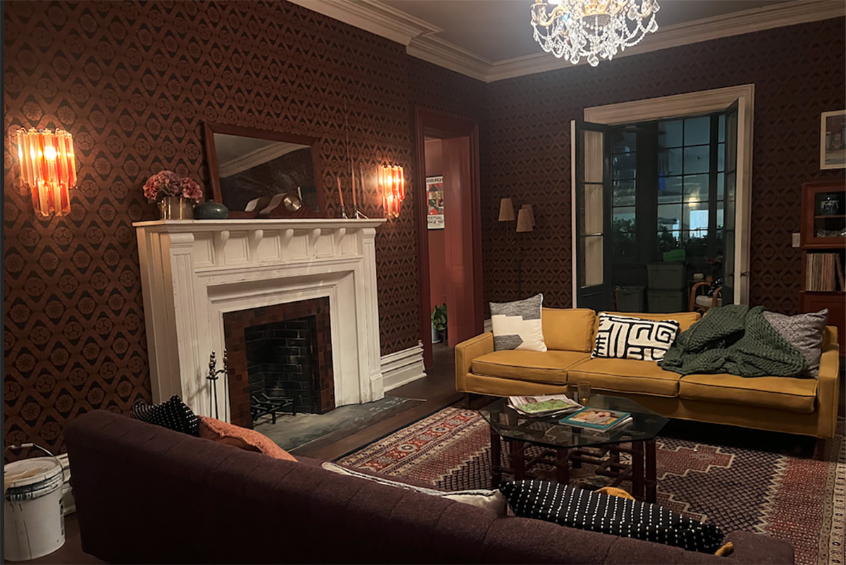 “In the living room, we did an amazing black and gold Japanese geometric covering which played so well with beautiful Murano glass sconces from Cityknick, which weighed a ton and required reinforced walls! The juxtaposition between rooms made it feel as if the living room was renovated by a previous owner, helping to convey that the home has had many lives prior to Aggie.”