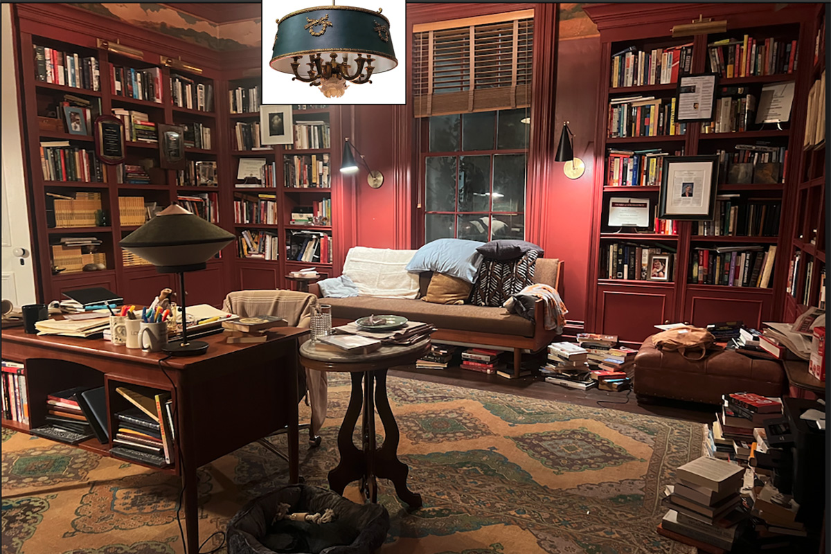 Aggie’s study, BTS. Myriad details of the writer’s life, including some of her many awards and distinctive furnishings. Note the pattern in the rug echoing the frieze atop the room. Inset: The 1950s French bouillotte chandelier. Study photo courtesy of Netflix.