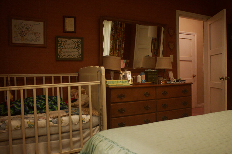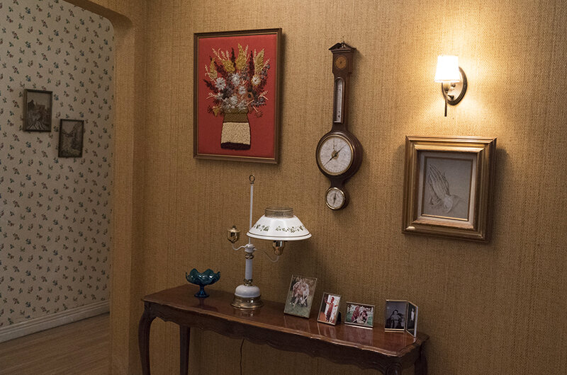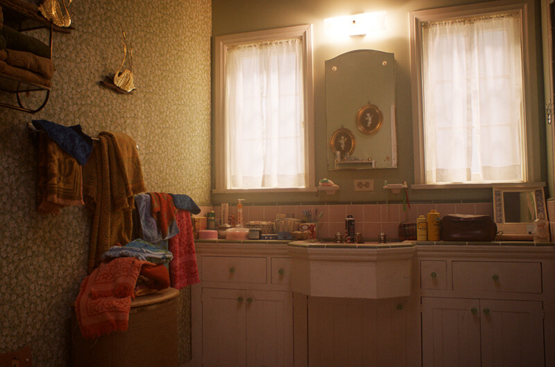 “For throughout the whole house, both the pilot and the series, we shopped for period correct books and board games, particularly to fill the living room shelves. Lots of framed embroidery. All bedding, including sheets, was vintage...all of the photos are in period frames. Tim’s mother loved to collect cute religious figurines and she loved plastic flowers, so we were always on the search for those to dress into the shelves all over the house and on her beloved organ.”