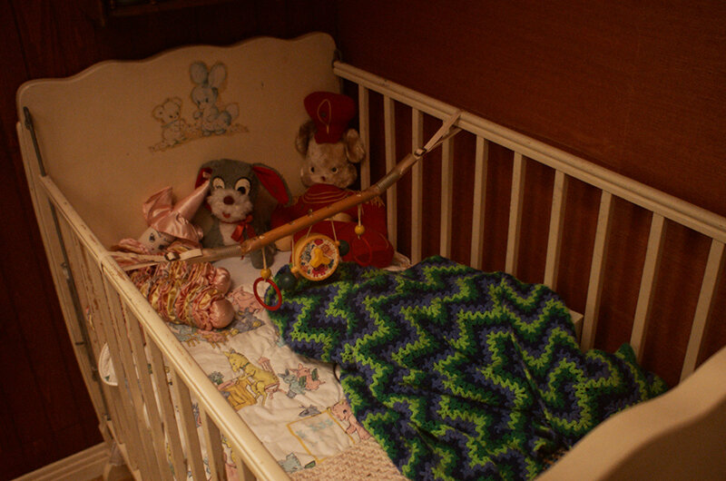 Unfolded laundry sits on a chair. Family photos in vintage frames. The wallpaper and moulding are heavily aged because 8 kids are running amok.