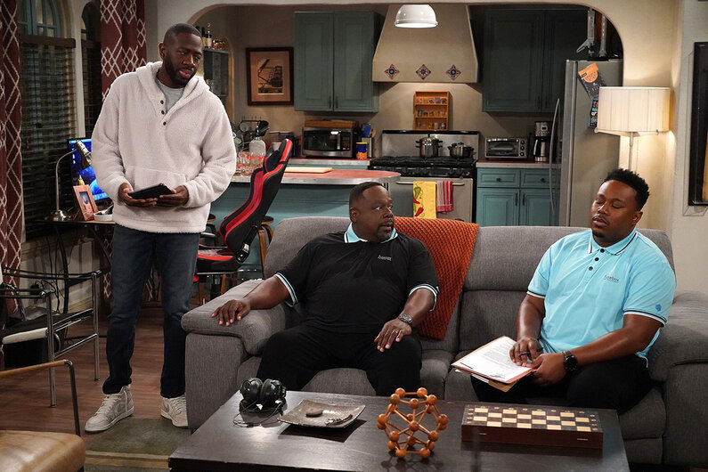 “We originally had the couch upholstered in a different, very expensive blue velvet but CBS Executives thought it was too blue, so we took it down a notch. Calvin’s recliner was from the original set, reupholstered this iteration by Warner Bros. Upholstery Department in oxblood red leather to pick up red accents.” Tichina Arnold, Cedric the Entertainer & Marcel Spears. Photo by Monty Brinton/CBS ©2023 CBS Broadcasting. All Rights Reserved.