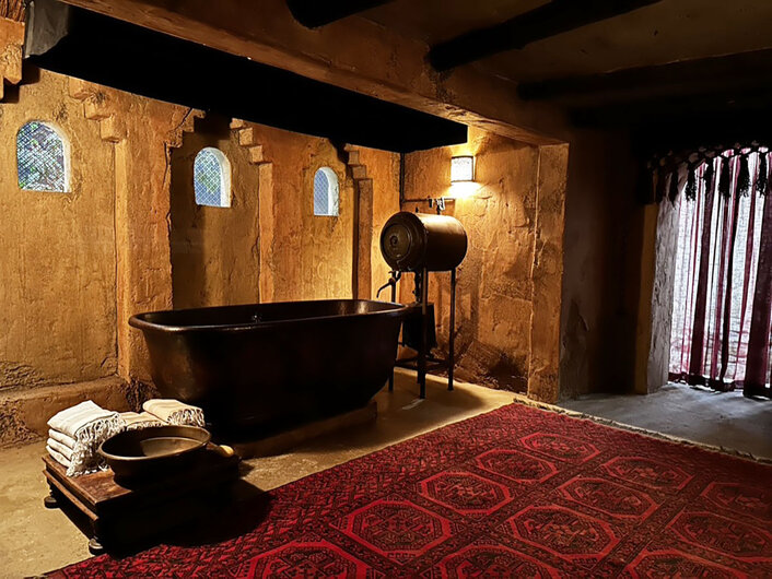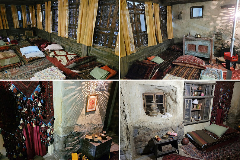 Afghani Rural Teahouse, entry: So many beautiful textural elements, from the entryway tapestry with the elongated tassels, the studded heavy wooden door, the window fretwork, the wooden furnishings, metal pots and containers, and the large brass samovar on the right. Courtesy of FX Networks. All rights reserved.