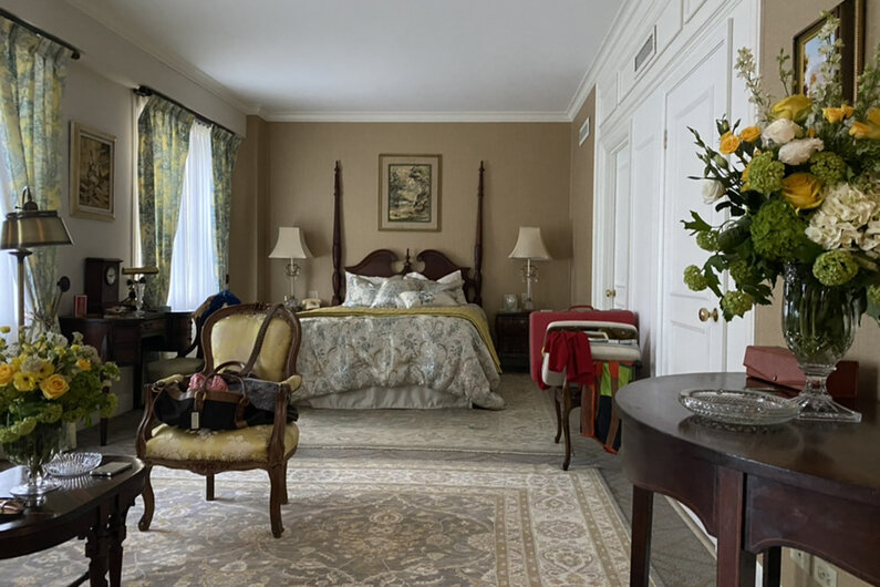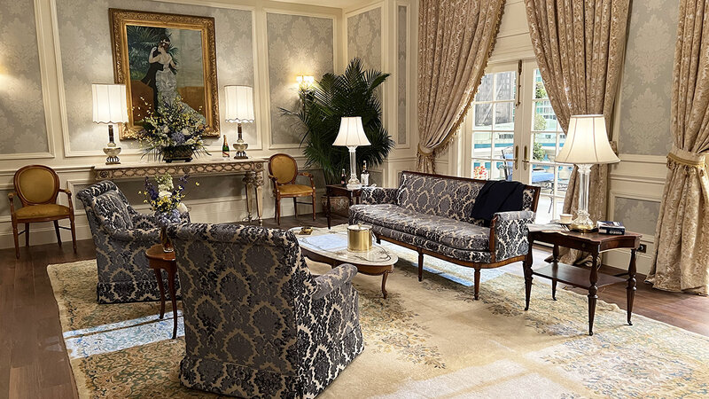 Daisy’s Suite, the Royal Orleans Hotel. “The curved sofa was a rare find and in mint condition with its original fabric. Much of the work done in NOLA required purchasing and shipping as the rental options were limited. Full dress of a built set by Additional Set Decorator Georgia Schwab.”