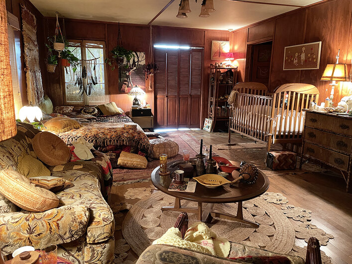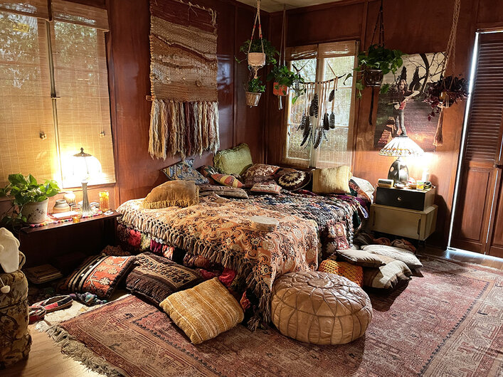 Band house: “As the Band grows comfortable in their home, notice some elements were changed, like the heavier curtains were removed to expose the lace and lighten the look; others were added, like throws, crochet, and the peacock and papasan chairs. As young people always do, they take hand-me-downs and re-interpret them, adding their own flare.” Photo courtesy Amazon Studios.