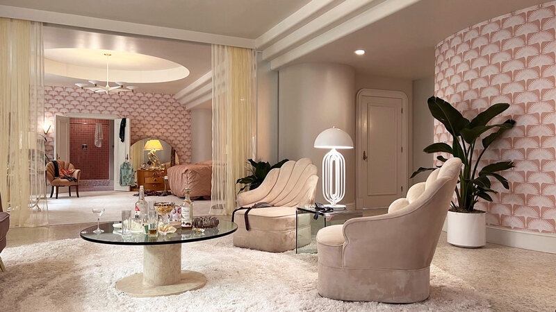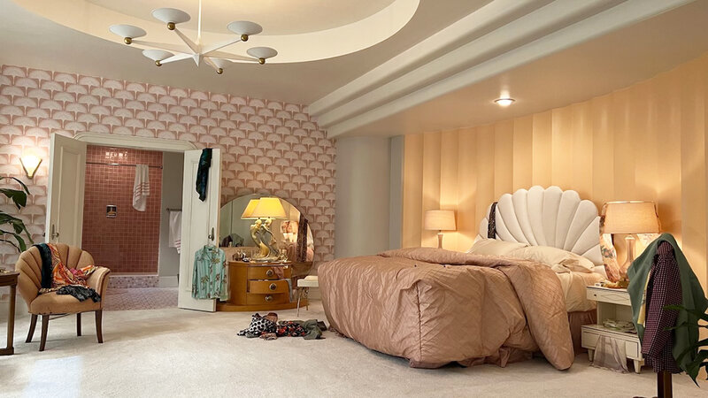 Miami Hotel, bedroom. “As with all of Daisy’s hotel rooms, there is a feeling of disarray in the space. Note the bathroom through the double doors. The hanging fixture was a particularly challenging find as the set called for a pair and was used as a key element when the scene was shot. Full dress of a built set by Set Decorator Andi Brittan.” Photo courtesy Amazon Studios.