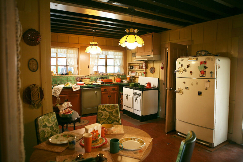 Band House kitchen. “Notice the space reflects elements from different eras as the former owner layered in some newer, less expensive items throughout her life. Evidence of the mess and layer of life added by the Band members is in evidence.” Photo courtesy Amazon Studios.