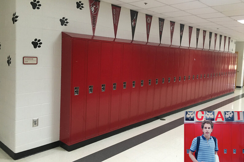 Luckily, we had a lot of prep time with the school, so we were able to get it all done in time for shooting, but ultimately we did dress: two long hallways, the gymnasium as a pep rally and two different dance scenes, the library and media center, the cafeteria, the front lobby, the administration office leading to the principal’s office, a computer lab, a science class, an English class, a locker room, the bus port and exterior entrance, and all of the main characters’ lockers (including the Connor Memorial sequence).