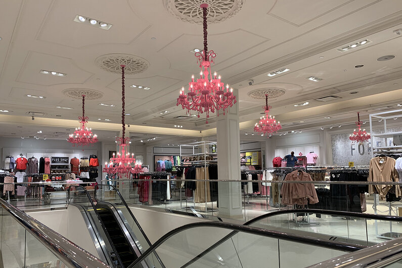 The various elements of the Inclusive Prom were a combination of purchased, rented, and fabricated pieces. The crystal forest was the result of an exhaustive search for domestic suppliers across the internet (the Covid-19 pandemic was in its burgeoning stages and created a huge bottleneck in goods being shipped from China, from where most of the goods originate). We also ordered about a dozen large-scale artificial trees from a vendor named Shop Wild Things. The trees were painted by staff, and then augmented with copious amounts of LED string lights, courtesy of the Lighting Fixtures Department. The six teardrop chandeliers were rented from Warner Bros. Property, which is one of a handful of vendors in Southern California where one can not only find large-scale vintage light fixtures, but fixtures which can also be found in multiples for such occasions.