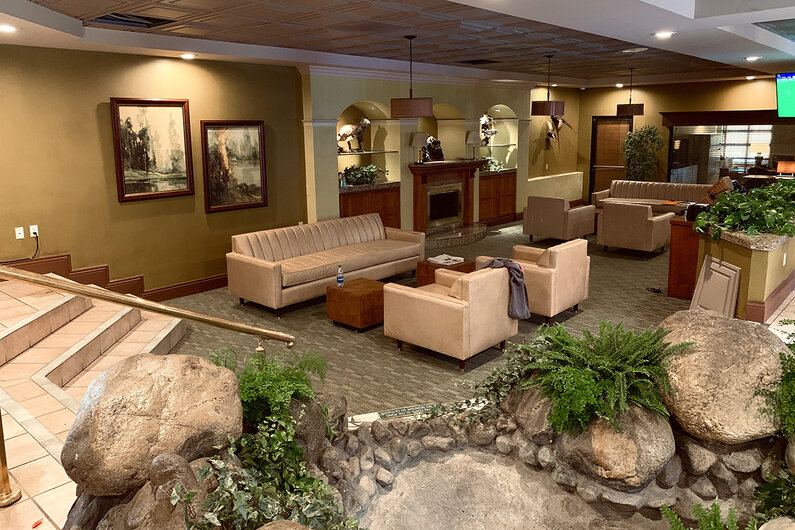 The arrival of the cast of Broadway actors Dee Dee Allen [Meryl Streep], Barry Glickman [James Corden], Angie Dickinson [Nicole Kidman] and Trent Oliver [Andrew Rannells] to Edgewater, IN, was like spilling bright colors of paint onto a beige surface. Murphy and McCall selected a hotel lobby interior in Koreatown, which featured a split-level conversation pit and an eccentric wishing well. Jamie and I worked up a design theme to de-accentuate the corporate luster of the location. We carpeted, painted, removed all the furniture including a pool table, and brought in a suite of channel-back upholstered pieces done in beige vinyl by Warner Bros. Upholstery. We added fake plants and taxidermy, and kept the color palette strictly controlled so it would strike a dramatic contrast with the deeply saturated costumes by Lou Eyrich.