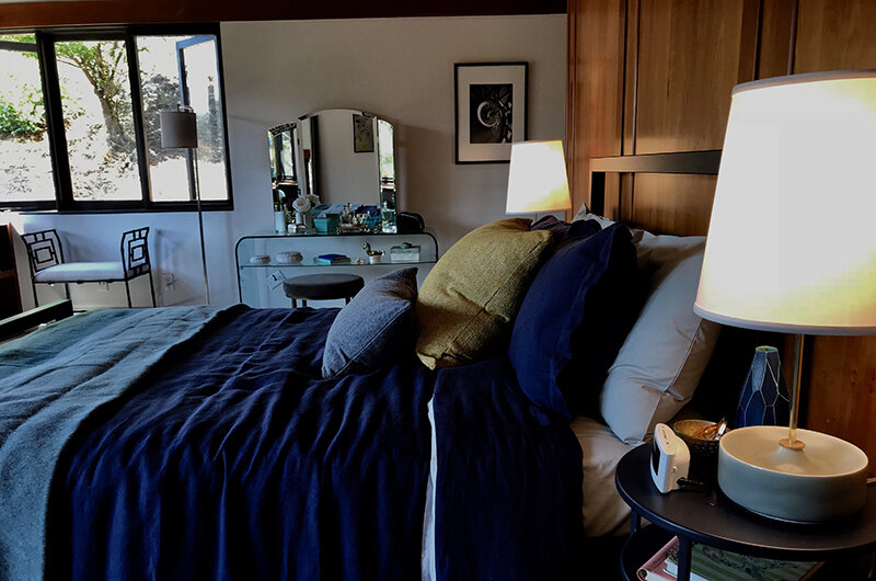 “I wanted the bedrooms to feel like you were visiting Grandma’s house. Simple and a bit mildewy, with an eclectic collection of furniture. The watercolor is of Steamers Lane in Santa Cruz...”