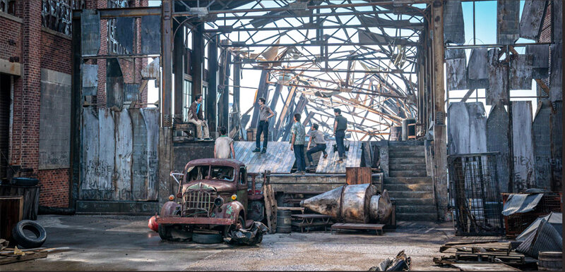 “Cool”...For many of the creators of WEST SIDE STORY, this would be their first musical. Working together in prep to bring together all elements of a production number: direction, choreography, cinematography, production design, set decoration...Set Decorator Rena DeAngelo SDSA brought in periphery items, including the huge turbine...but through rehearsals on the built stage, improvisation moved the rusted-out items into frame for the final sequence. Not intended! Image courtesy of 20th Century Studios ©2021. All Rights Reserved.