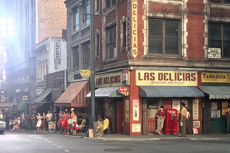 W68th...View of the street, a real neighborhood, transformed to the period, dressing each storefront and apartment window. Note the corner restaurant Las Delicias was in the background of the previous photo. Image courtesy of 20th Century Studios ©2021. All Rights Reserved.