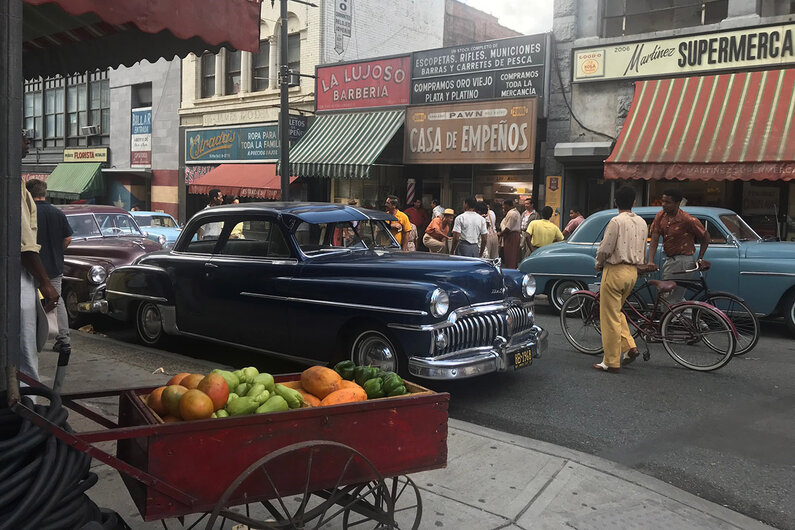 W68th, street traffic...Mangos and chayote for sale in the very Latinized neighborhood. Image courtesy of 20th Century Studios ©2021. All Rights Reserved.