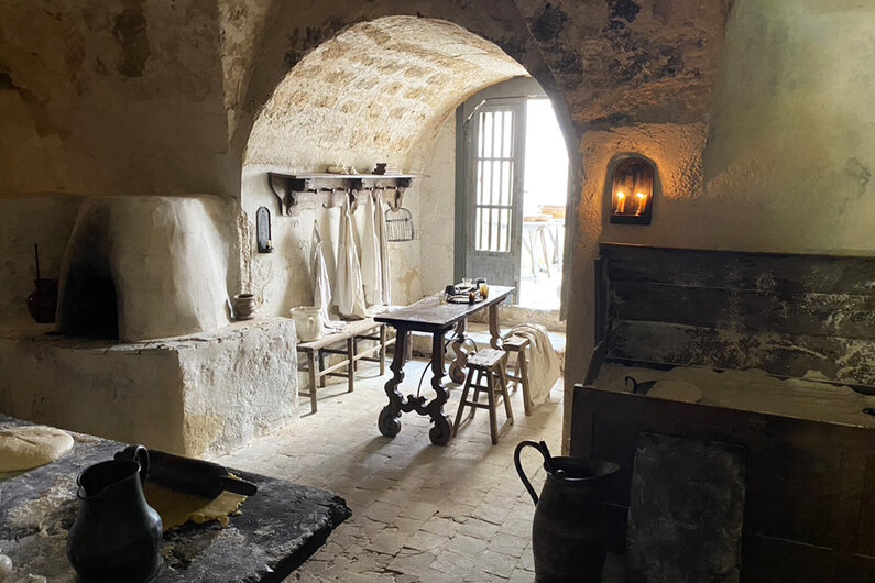 Theater...Because this was filmed in Sicily during Covid, there were many restrictions and considerations, including building an outdoor theater, which was appropriate for both the time period and the well-being of all participating! Photo courtesy of Metro-Goldwyn-Mayer Pictures. All Rights Reserved.