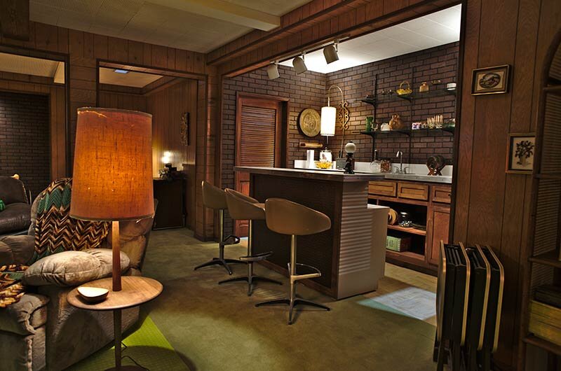 The sets aren't all gloss and bold design. Human elements lend warmth to Kai's basement lair. Bronzed baby shoes sit on a shelf - one assumes they are childhood relics of Kai and Winter (played by AHS alum Evan Peters and franchise newcomer Billie Lourd, respectively). The basement is a warm cluster of ‘70s wood tones and earthy fabrics. A kind of retro cocoon where Kai hatches his plans, it's the kind of room everyone of a certain age has been in—classic ‘70s suburban cool man cave. And yes, there's period stereo equipment. A running gag exists in a fantastically geeky grade school photo of Claire's ex-husband Rick. She's used the same photo in many sets over the years.