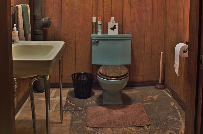 “Another ominous light fixture looms above dizzying texture in the master bath. It's all practical plumbing, on a real second floor set onstage.